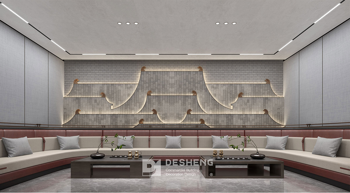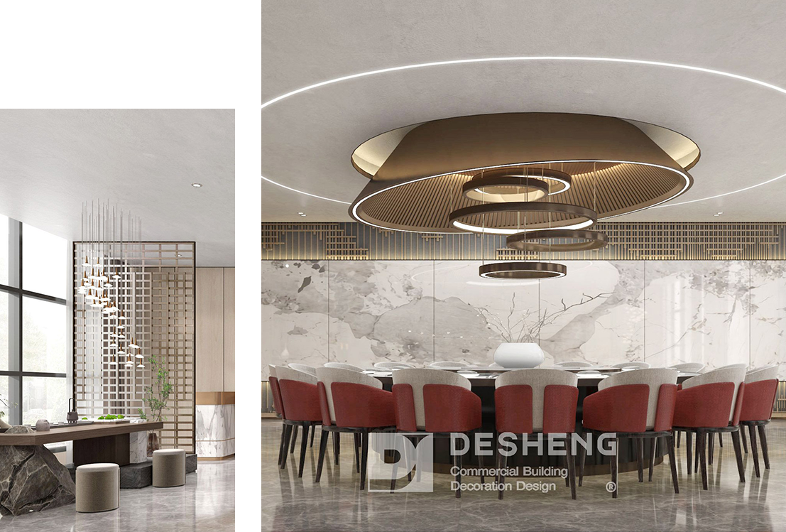 · 大理石背景墙如山水长卷般铺陈,与顶部的环形艺术吊灯形成“天圆地方”的中式隐喻;红灰撞色的座椅既显商务气场,又通过细节呼应整体风格。角落的中式陈设与艺术画作,更是在潜移默化中传递企业文化品味。