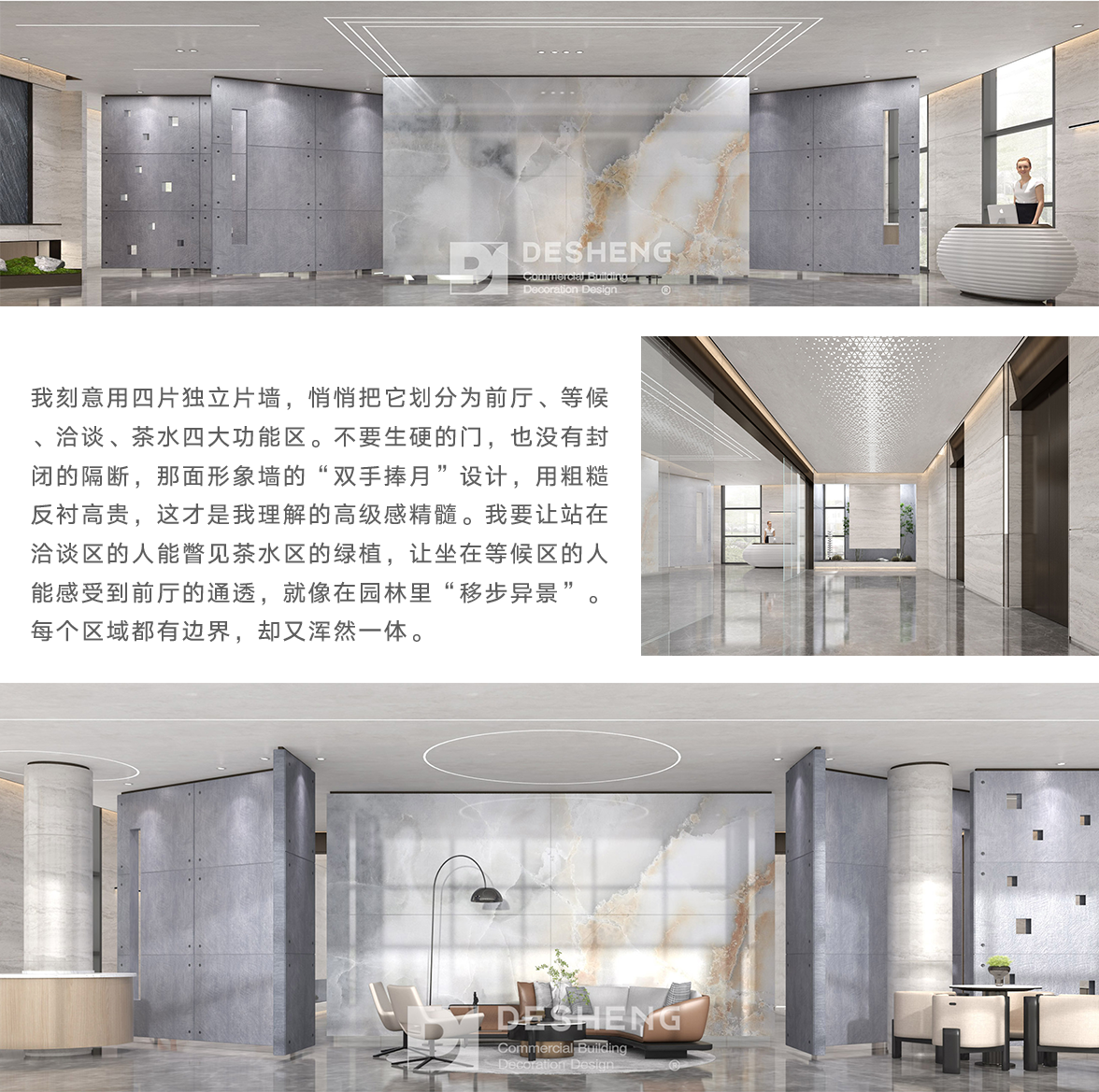 · 以无门片墙划分出门廊、接待、会议、办公、茶室、餐厅六大功能区,既保证空间通透,又让每个区域“各自成景”,恰如会议区与办公区以玻璃隔断隐隐区隔,视野却完全贯通;