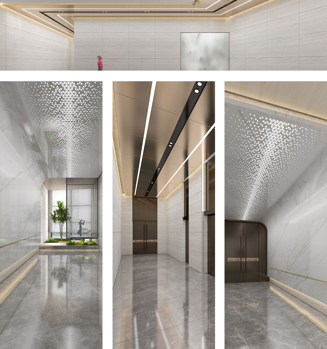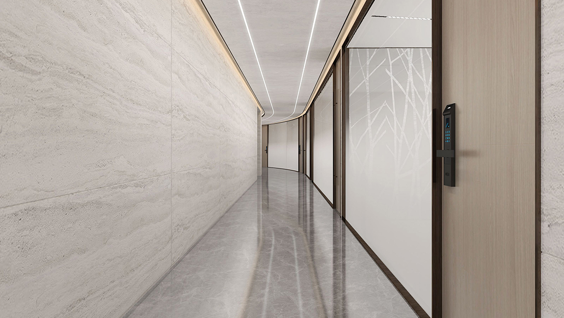 我执着于材质的“对话感”。左侧墙面选用的是带有流动纹理的白色大理石,它像一幅未干的水墨,在光线下不断变幻着层次;而天花板的“星光”设计,是对自然天光的艺术化转译。我希望当人们行走在这里时,能感受到“斗转星移”的惊喜。在廊道的尽头,我特意营造了一处“绿洲”。那株挺拔的绿植,搭配艺术感的雕塑,还有通透的玻璃幕墙,是我对“自然介入建筑”的尝试。
