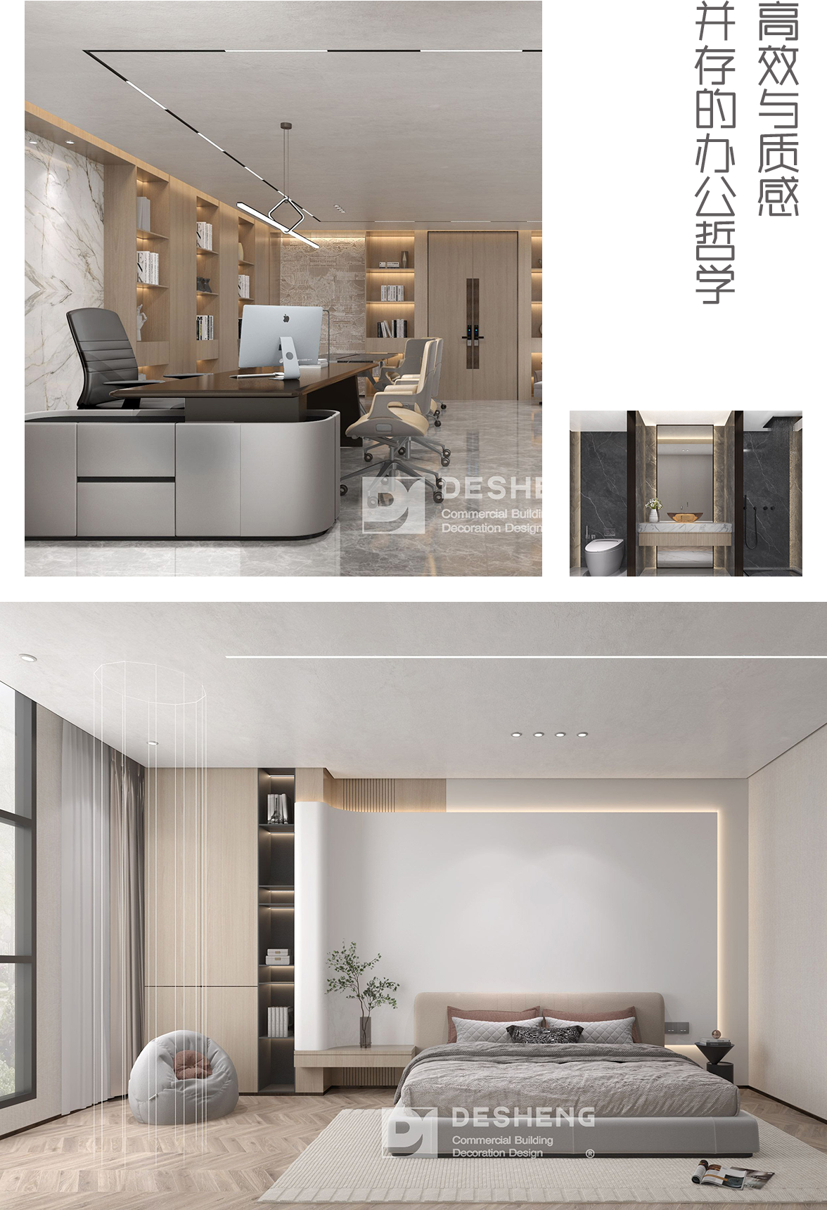 在总经理办公室这方空间,我想营造的是“商务气场与人文温度的共生”。浅木色的柜体柔和了空间,大理石背景墙又彰显着专业与格调,灯光的层次设计让每一处陈设都恰如其分地展现价值,既能运筹帷幄,又能在细节中感受到设计带来的舒适与尊重。
