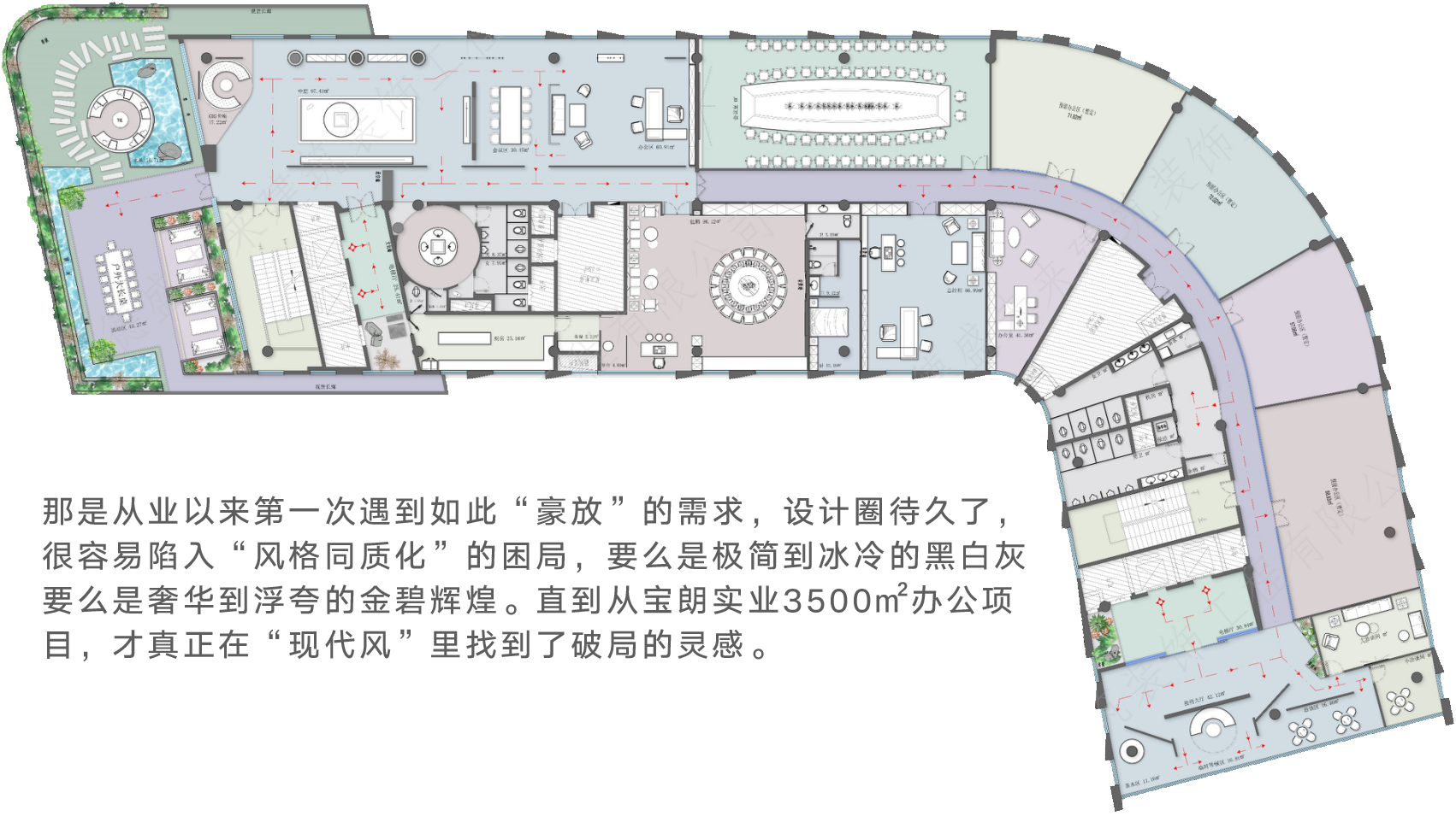 2022年盛夏,兴隆湖畔的风裹挟着水汽掠过眼前的大厦,让这场设计之旅从一开始就充满了未知与锋芒,【华银集团・宝朗实业】3500㎡办公项目。甲方提出的需求:800㎡给老板做单人办公区,1500㎡屋顶花园全归老板一人支配,剩余区域做普通办公。